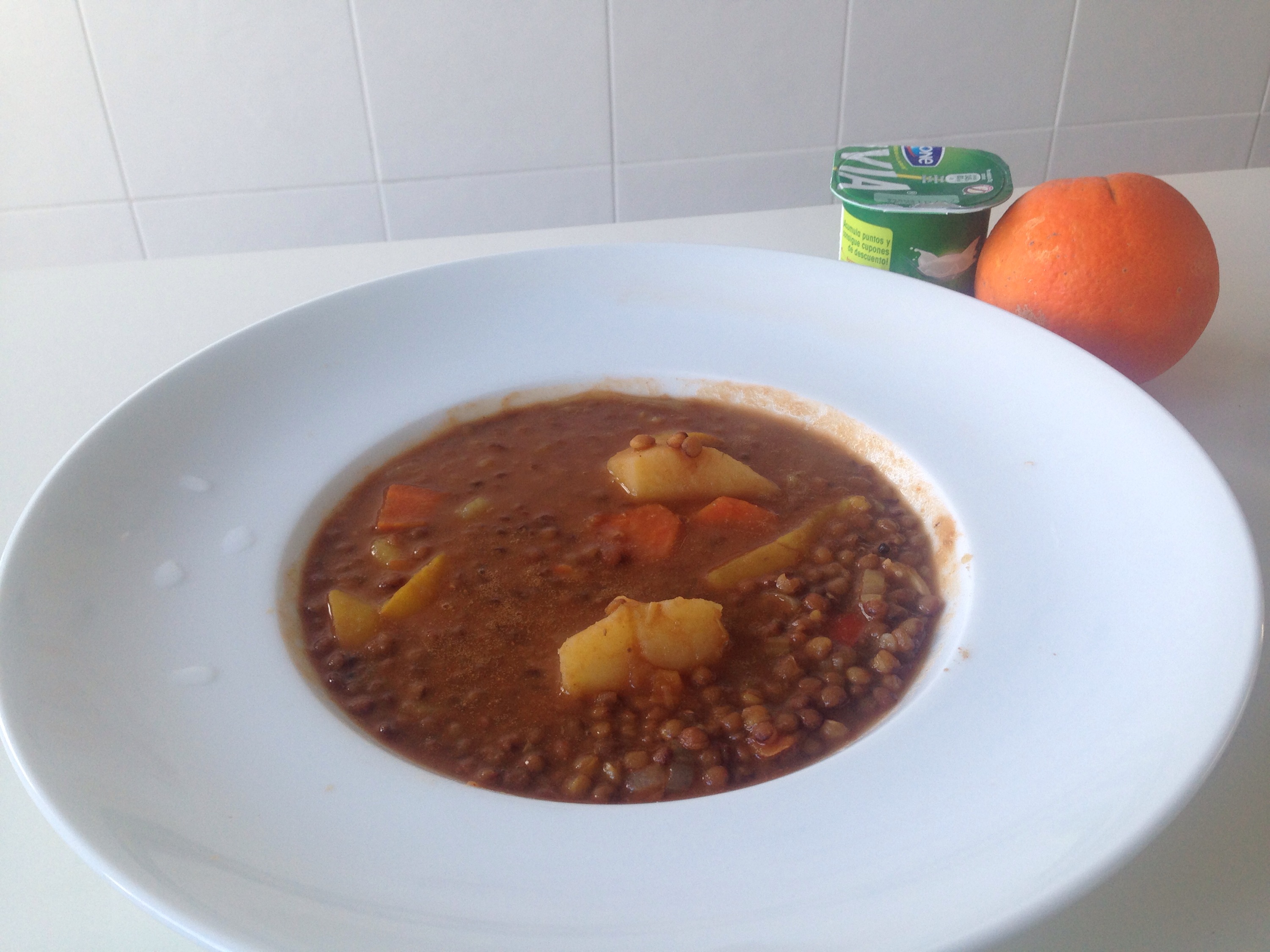 De postre: naranja para aumentar la absorción del hierro y un yogur para a los que el consumo de legumbres les cause flatulencias asociados a sustancias presentes en ellas como son algunos oligosacáridos no digeribles como rafinosa y estaquiosa). Las bacterias del yogur ayudarán mejorando su digestibilidad.