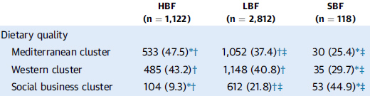 «En términos de calidad dietética, los participantes SBF eran más propensos a consumir más energía, particularmente de fuentes animales y colesterol dietético; tienen la menor ingesta de fibra y carbohidratos; y tienden a consumir más bebidas alcohólicas y azucaradas, así como más carne roja. En comparación con HBF, los participantes en el grupo LBF presentaban mayor ingesta diaria de energía animal de proteínas, y colesterol de la dieta, y menor ingesta de azúcar y polisacáridos. Este grupo también tuvo una menor ingesta de frutas y verduras, cereales integrales y aceite de oliva, y un mayor consumo de cereales refinados, carnes rojas, comida rápida y platos precocinados, así como carne magra y mariscos. Los participantes en el grupo HBF presentaron significativamente mayor ingesta de hidratos de carbono y fibra dietética, y tendían a mayor cantidad consumida de frutas y verduras, cereales integrales, productos lácteos con alto contenido graso y dulces.(…)